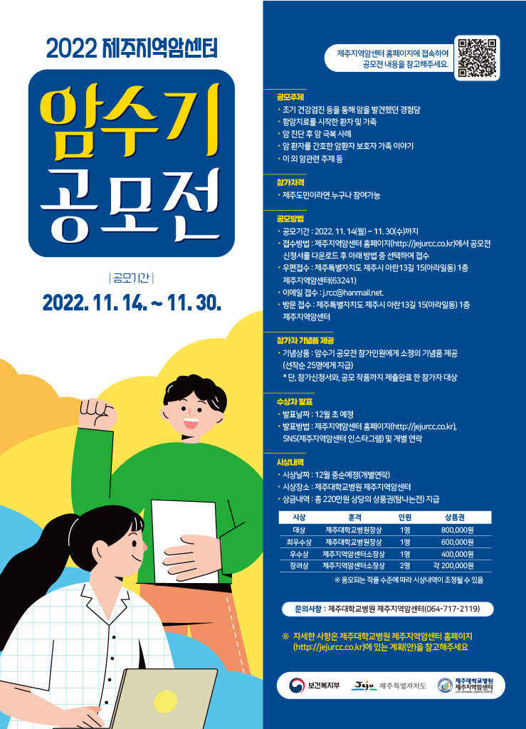 제주지역암센터는 제주도민들을 대상으로 암예방 및 암검진 홍보 사업 등을 진행하고 있습니다. 이와 같이 제주도민들에게 암예방을 홍보하고 암검진 수검률 향상 및 인식 제고를 위해 제주지역암센터 암 수기 공모전을 개최하여 더욱더 효과적인 사업 홍보를 진행하겠습니다. 많은 관심과 신청 부탁드립니다. 감사합니다. * 참가자분들에게 드리는 기념품은 모든 접수가 끝난뒤에 12월 초에 우편으로 발송하겠습니다. * 자세한 사항은 계획(안) 참고 및 제주지역암센터(064-717-2119)로 문의 바랍니다.