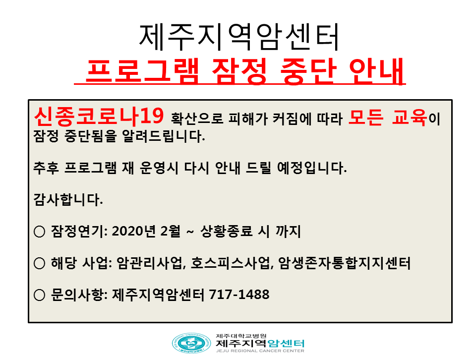코로나 바이러스19 확산으로 인한 제주지역암센터 프로그램 잠정 중단 안내..